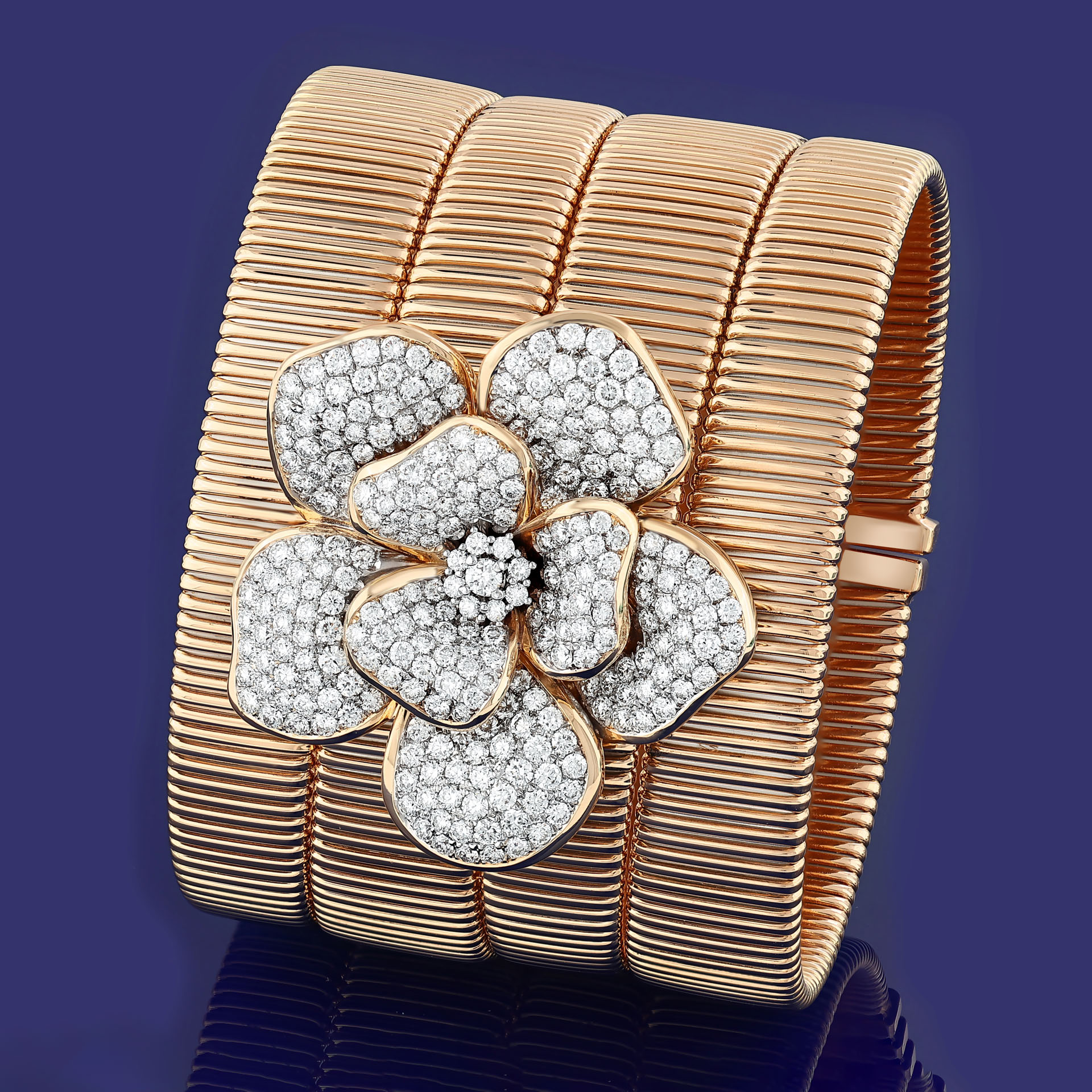 Crafted in tubogas gold and embellished with diamonds, La Rosina bracelets transform the rose into a continuous, flowing form. Soft curves and layered structures echo the natural motion of petals in bloom. Each piece expresses devotion through sculptural design and artisanal execution.