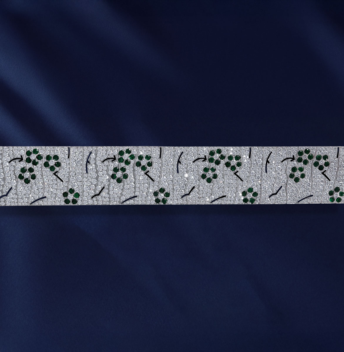 Diamond bracelets are handcrafted with continuous white diamond settings articulated in fluid gold constructions. These high jewellery diamond bracelets emphasize balance, movement, and controlled brilliance on the wrist.