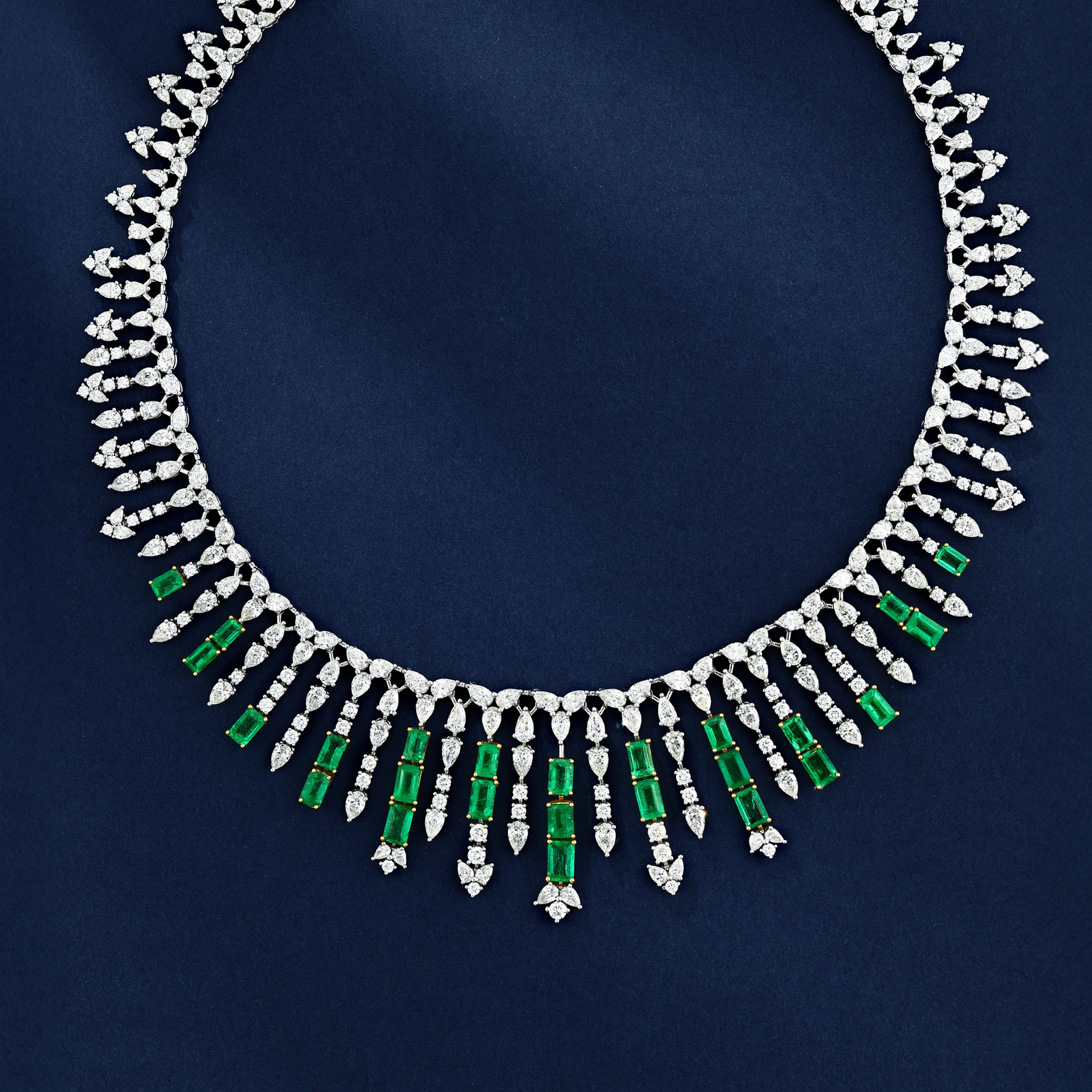 Diamond necklaces are handcrafted with white diamonds arranged in structured high jewellery compositions that follow the natural line of the neckline. Each luxury diamond necklace highlights refined gold craftsmanship and exceptional diamond quality.