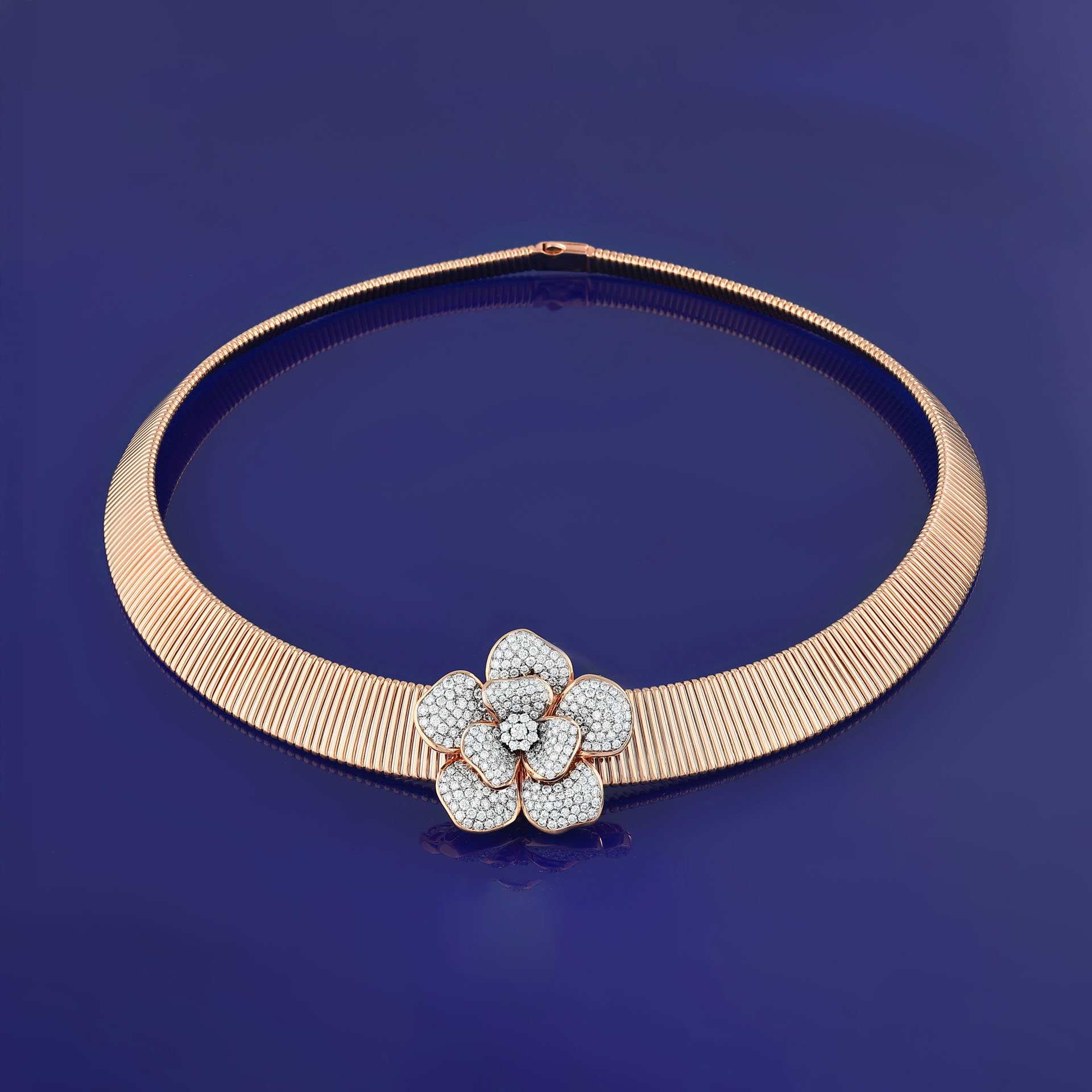 La Rosina necklaces are crafted in tubogas gold and adorned with diamonds, forming blooming rose-inspired compositions. The flower unfolds along the neckline, creating a sense of rhythm and presence. Each necklace translates love into gold, craftsmanship, and enduring expression.