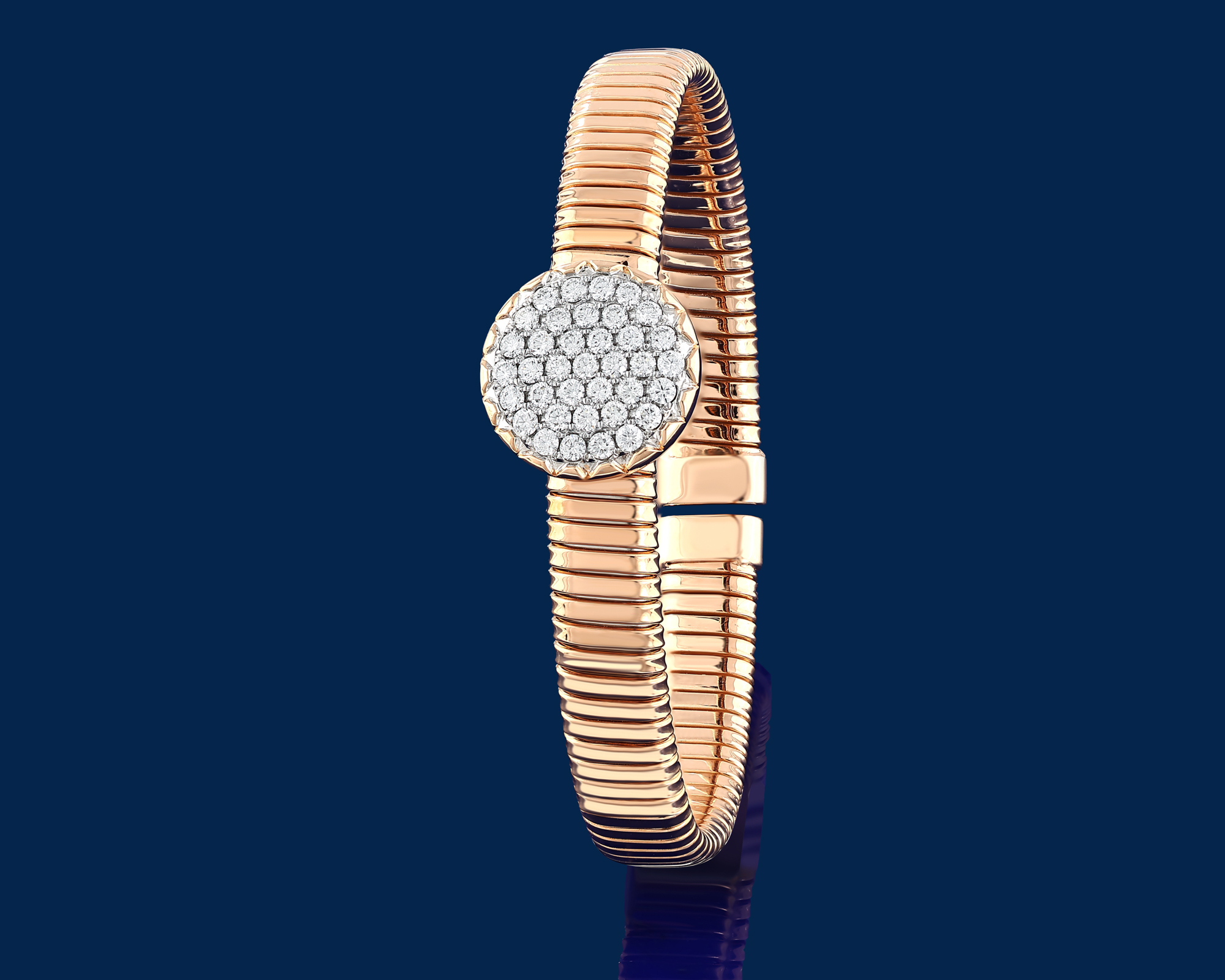 Crafted in tubogas gold and adorned with diamonds, Via Toledo bracelets are conceived to move freely on the wrist. Their flexible construction mirrors the continuous flow and layered character of the avenue that inspires the collection. Il Bernardo’s artisanal execution transforms this movement into a controlled and enduring jewel for the wrist.