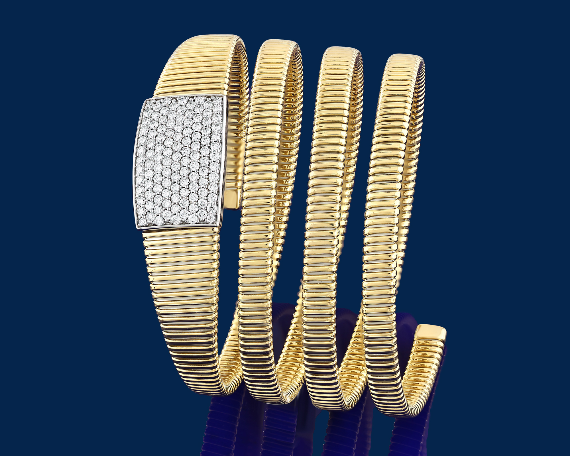 Crafted in tubogas gold and adorned with diamonds, Via Toledo bracelets are conceived to move freely on the wrist. Their flexible construction mirrors the continuous flow and layered character of the avenue that inspires the collection. Il Bernardo’s artisanal execution transforms this movement into a controlled and enduring jewel for the wrist.