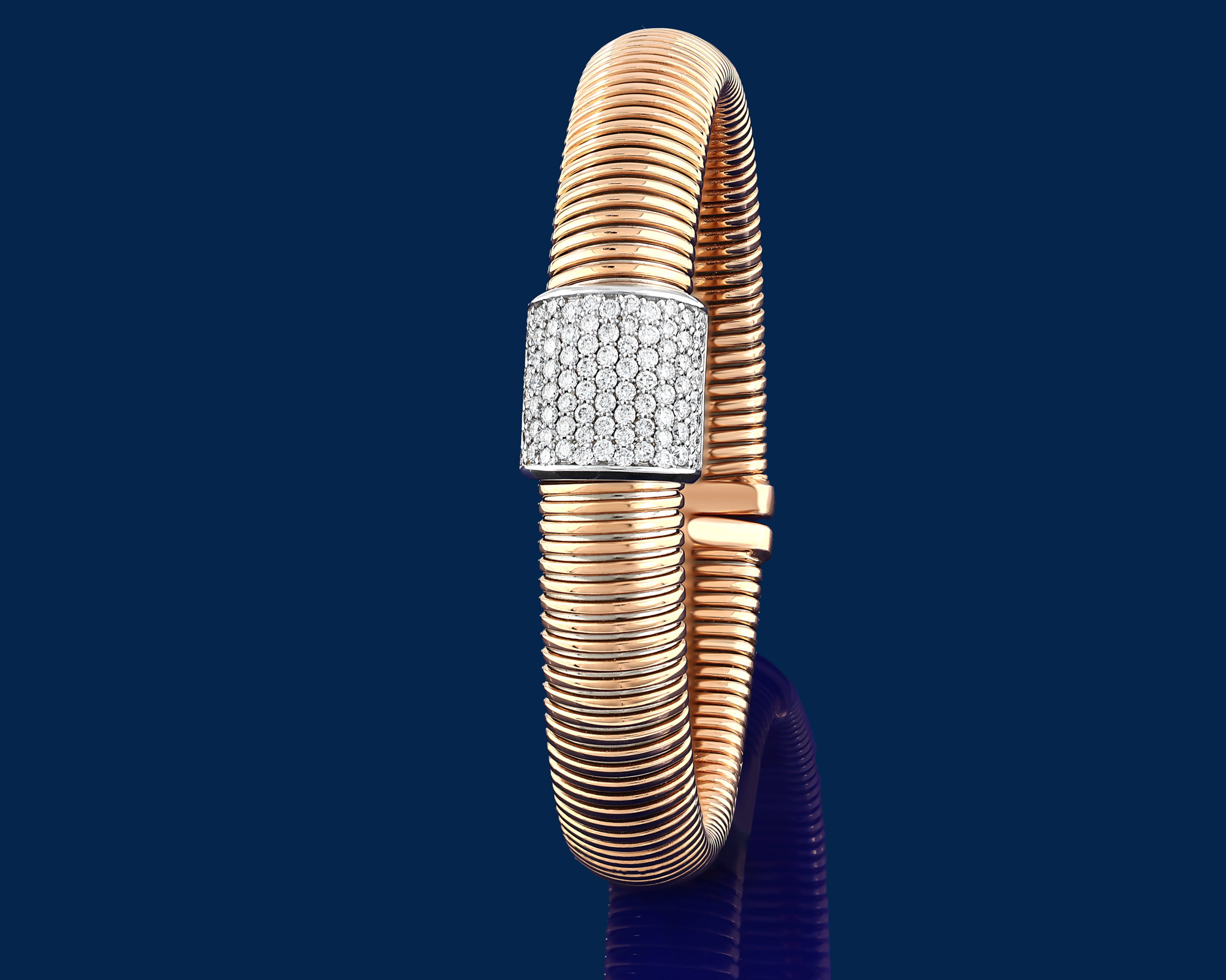 Crafted in tubogas gold and adorned with diamonds, Via Toledo bracelets are conceived to move freely on the wrist. Their flexible construction mirrors the continuous flow and layered character of the avenue that inspires the collection. Il Bernardo’s artisanal execution transforms this movement into a controlled and enduring jewel for the wrist.