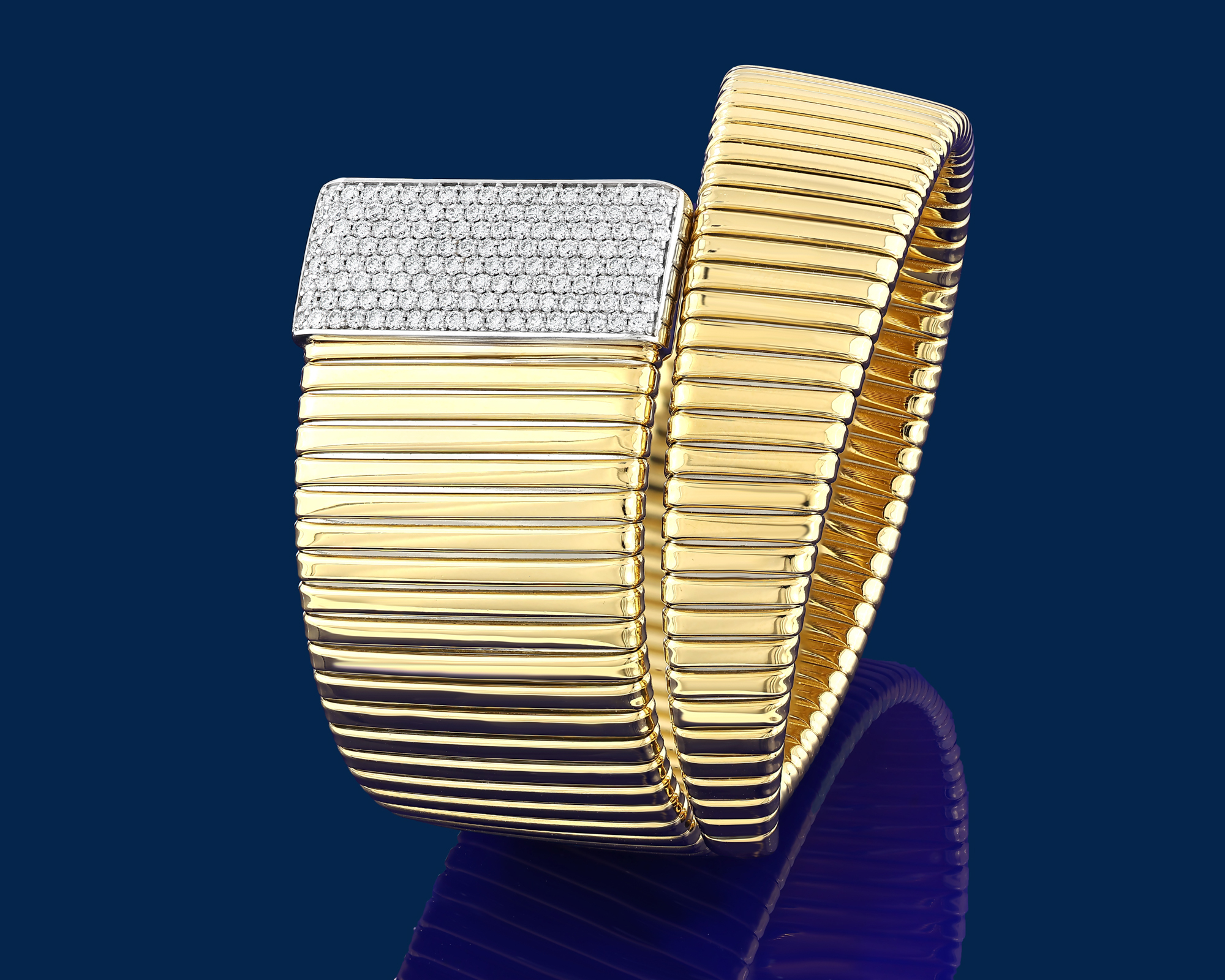 Crafted in tubogas gold and adorned with diamonds, Via Toledo bracelets are conceived to move freely on the wrist. Their flexible construction mirrors the continuous flow and layered character of the avenue that inspires the collection. Il Bernardo’s artisanal execution transforms this movement into a controlled and enduring jewel for the wrist.