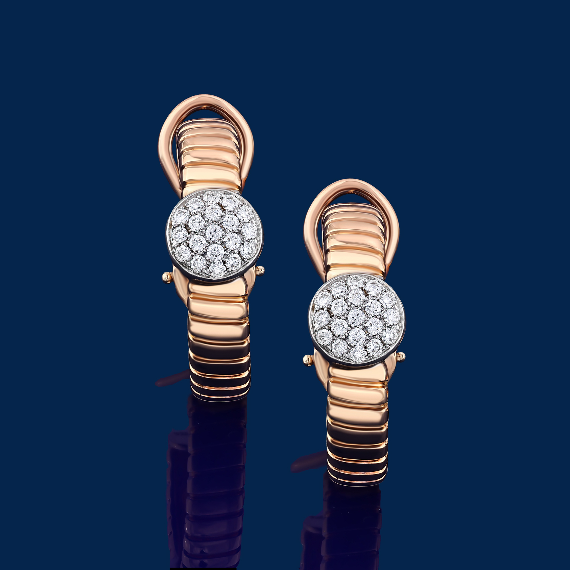 Crafted in tubogas gold and illuminated with diamonds, Via Toledo earrings bring sculptural movement to the face. Their articulated geometry follows the natural motion of the head, allowing light and form to shift with every gesture. Il Bernardo’s goldsmith signature brings control and mastery to this dynamic expression worn close to the face.