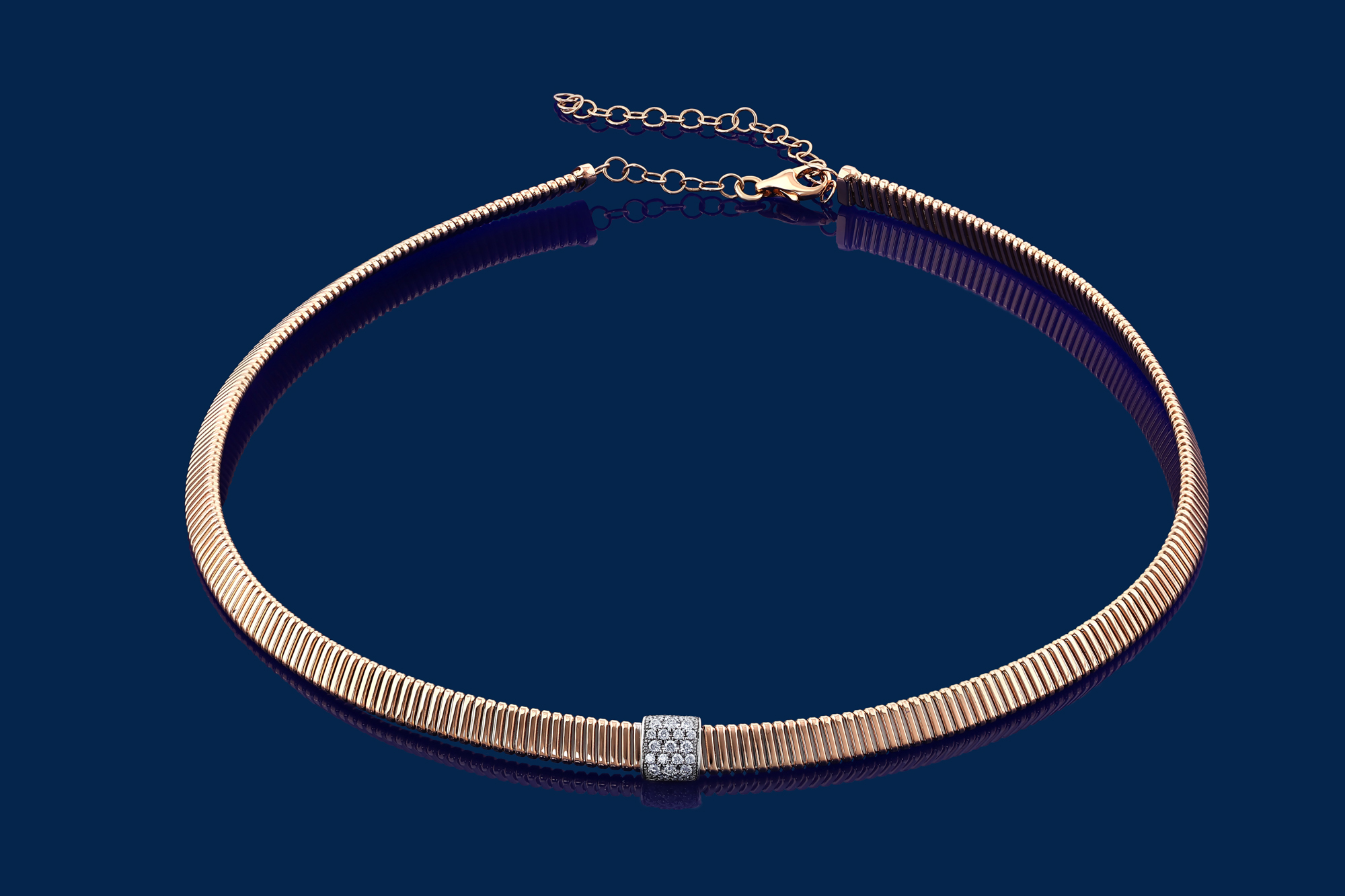 Via Toledo necklaces are crafted in tubogas gold and set with diamonds, designed to rest along the neckline as a structured yet fluid composition. The geometric forms follow the movement of the body, creating rhythm across the décolletage. Through precise craftsmanship, Il Bernardo translates architectural energy into a necklace defined by motion and presence.