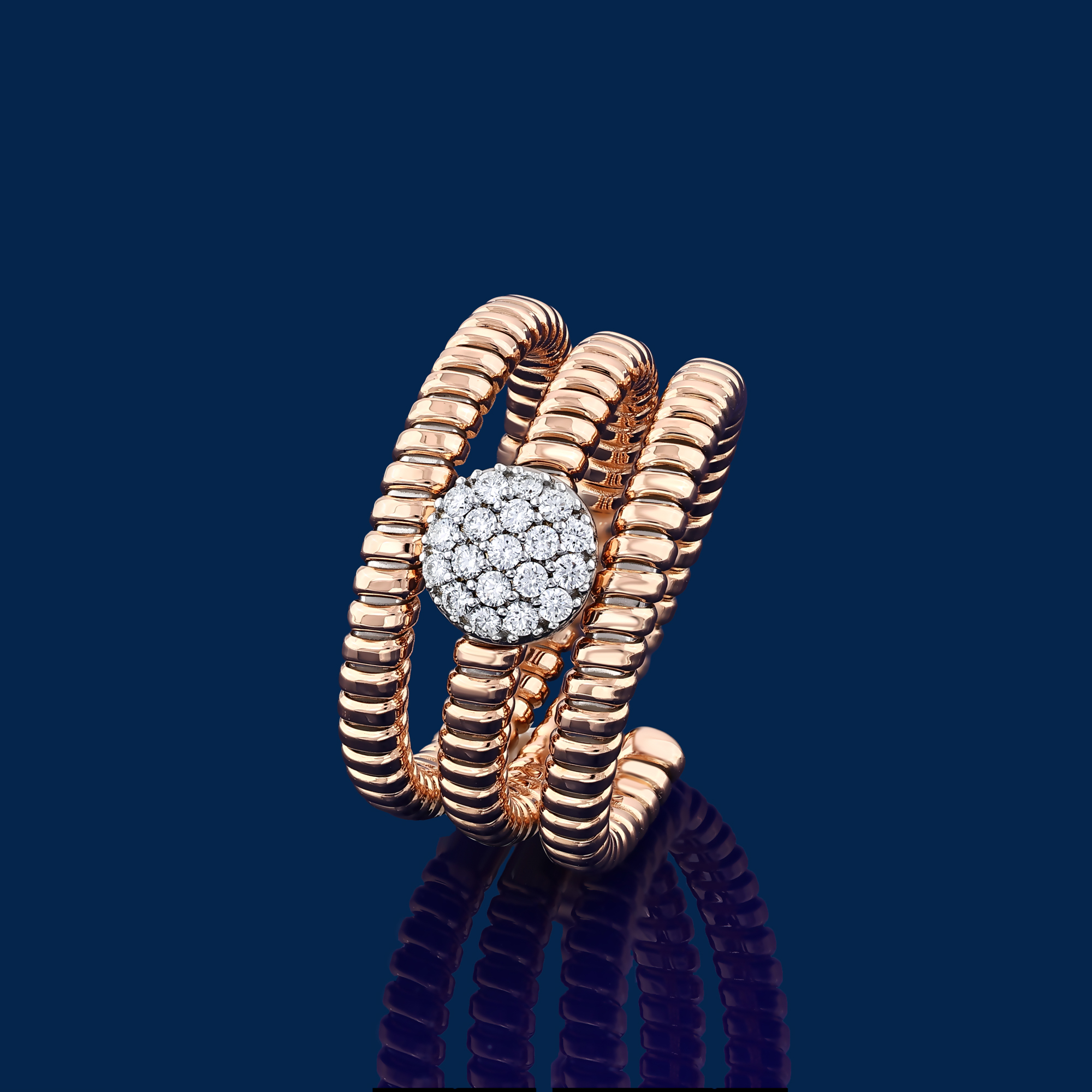 Via Toledo rings are sculpted in tubogas gold and accented with diamonds, designed to sit with strength and structure on the hand. Geometric silhouettes and dynamic contours create a sense of motion captured within solid form. Each ring reflects Il Bernardo’s craftsmanship, where architectural rhythm is translated into a powerful statement worn on the finger.