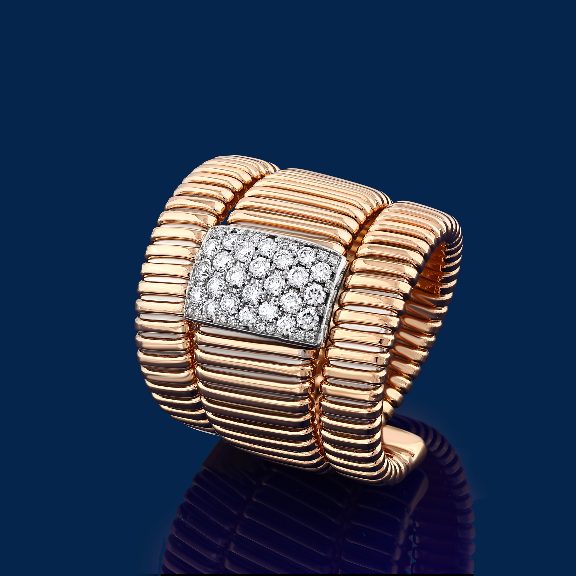 Via Toledo rings are sculpted in tubogas gold and accented with diamonds, designed to sit with strength and structure on the hand. Geometric silhouettes and dynamic contours create a sense of motion captured within solid form. Each ring reflects Il Bernardo’s craftsmanship, where architectural rhythm is translated into a powerful statement worn on the finger.