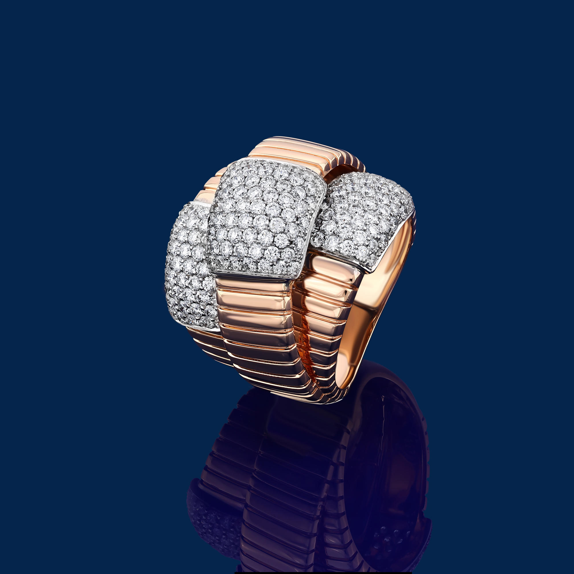 Via Toledo rings are sculpted in tubogas gold and accented with diamonds, designed to sit with strength and structure on the hand. Geometric silhouettes and dynamic contours create a sense of motion captured within solid form. Each ring reflects Il Bernardo’s craftsmanship, where architectural rhythm is translated into a powerful statement worn on the finger.