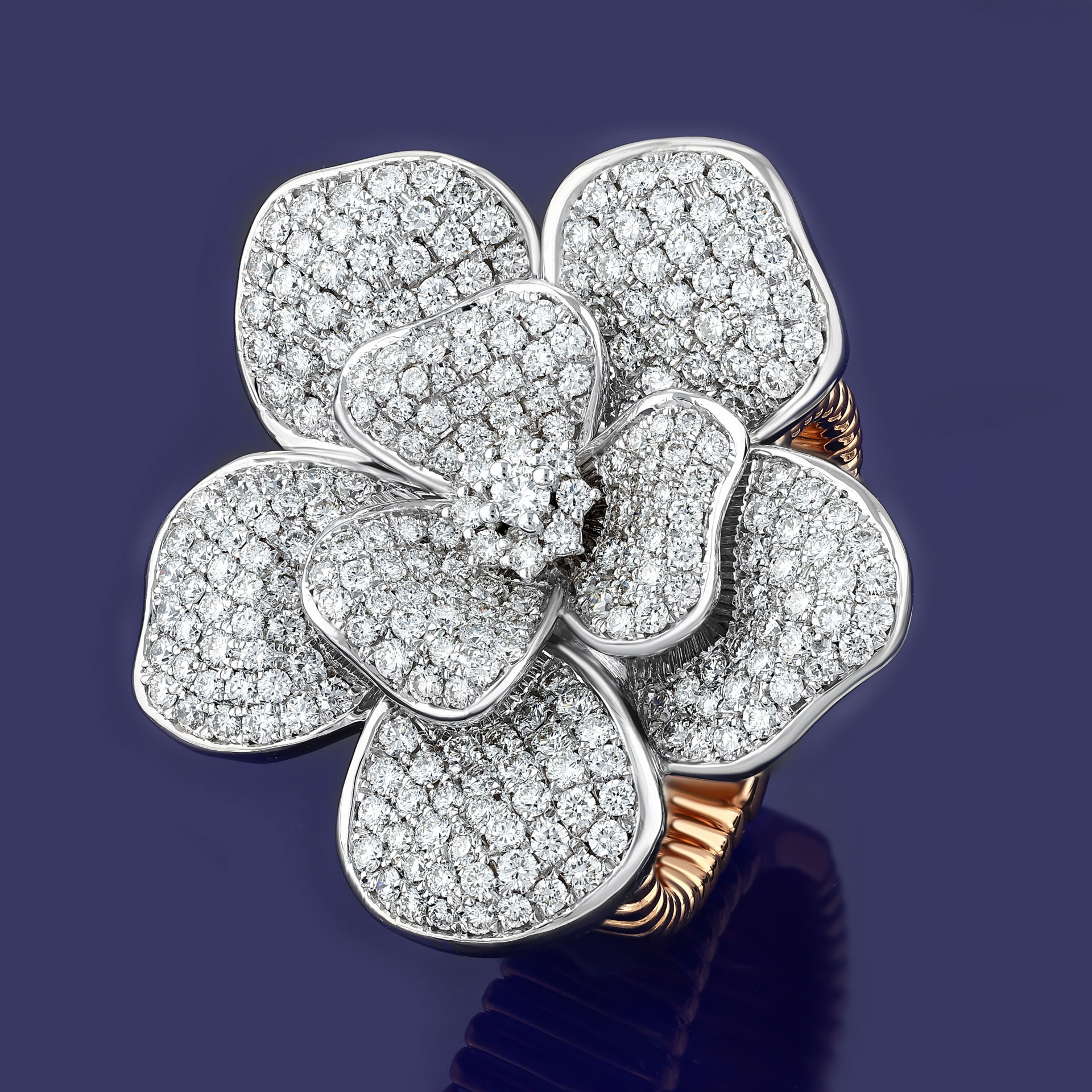 La Rosina rings feature rose motifs sculpted in tubogas gold and illuminated by diamonds. Designed as intimate high jewellery creations, the flower emerges with volume and strength. Every ring embodies love expressed through precision, structure, and craftsmanship.
